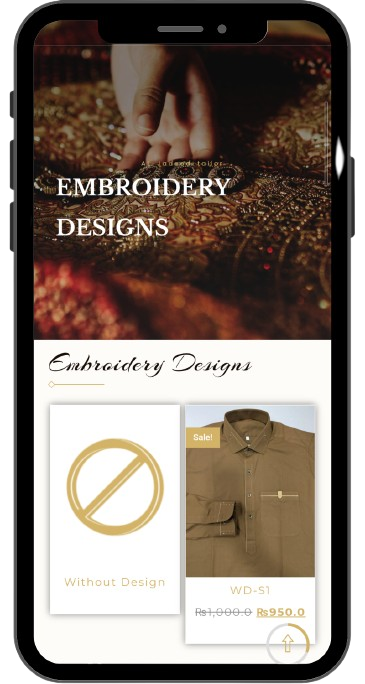 Kapra cart mein daalne ke baad Designs Page par barhiye. Agar aap embroidery design lena chahte hain to apna pasandida design cart mein add karein. Aur agar design nahi chahiye, to simple “None” option cart mein add kar dijiye.
